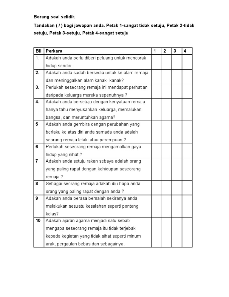 Kajian Penyelidikan 11 Pendahuluan Nilai murni sewajarnya menjadi asas kepada pembinaan dan pembangunan manusia. Contoh Borang Soal Selidik Stress Di Kalangan Pelajar. Contoh Borang Soal Selidik Tekanan Kerja Contoh O Cute766.