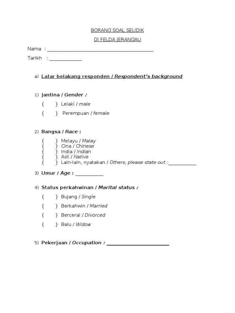 Berkahwin Bujang Duda Ibu tunggal 7 Status anda dalam. Anda hanya perlu menanda jawapan yang paling tepat dengan pandangan. BORANG SOAL SELIDIK KAJIAN KEPUASAN PELANGGAN TERHADAP PERKHIDMATAN JABATAN PENDAFTAR.