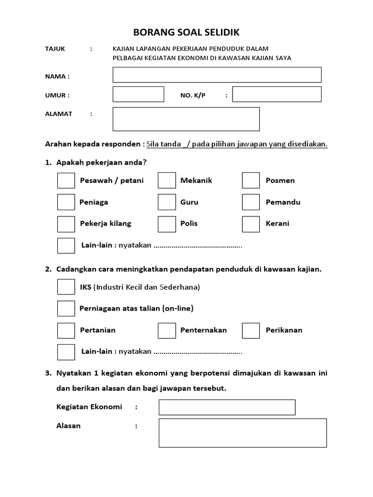 Borang Soal Selidik Mengenai Kegiatan Ekonomi Di Kawasan Kajian Lapangan