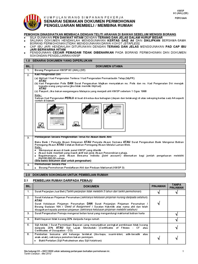 4 Dokumen yang diperlukan Borang Pengeluaran KWSP 9C AHL D5 Salinan dokumen pengenalan diri jika bukan pemegang Mykad Maklumat Akaun Bank Ahli DIGALAKKAN membawa buku akaun bank atau salinan akaun semasa membuat permohonan Borang KWSP 3 pindaan jika pengecaman cap ibu jari gagal di kaunter permohonan melalui pos. 1152020 Tidak pernah membuat Pengeluaran Perumahantelah membuat pengeluaran untuk membeli rumah tetapi telah menjualnyamelupuskan pemilikan. Salinan dokumen pengenalan diri jika bukan pemegang Mykad 3.