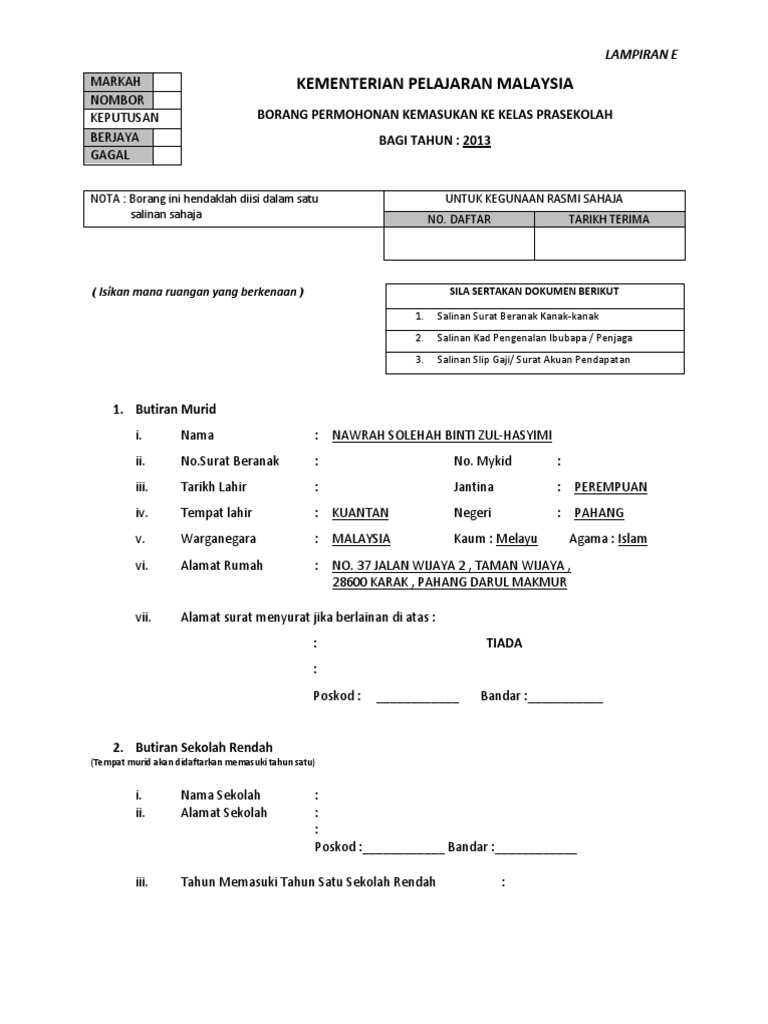 Borang permohonan kemasukan darjah 1. Pendaftaran Murid Tahun 1 2021 2022 Online Login Spatkpm. BORANG PERMOHONAN KEMASUKAN MURID DARJAH SATU PANDUAN RINGKAS PERMOHONAN 1 Sila baca panduan yang disediakan dengan teliti sebelum mengisi borang 2 Semua maklumat hendaklah ditulis dengan HURUF BESAR 3 Hanya maklumat permohonan yang lengkap akan diproses. Permohonan pendaftaran murid tahun 1 ambilan 2022 dan 2023 akan DIBUKA mulai 1 Mac 2021 Isnin secara atas talian di Sistem Pendaftaran Atas Talian SPATKPM Kementerian Pendidikan Malaysia KPM.