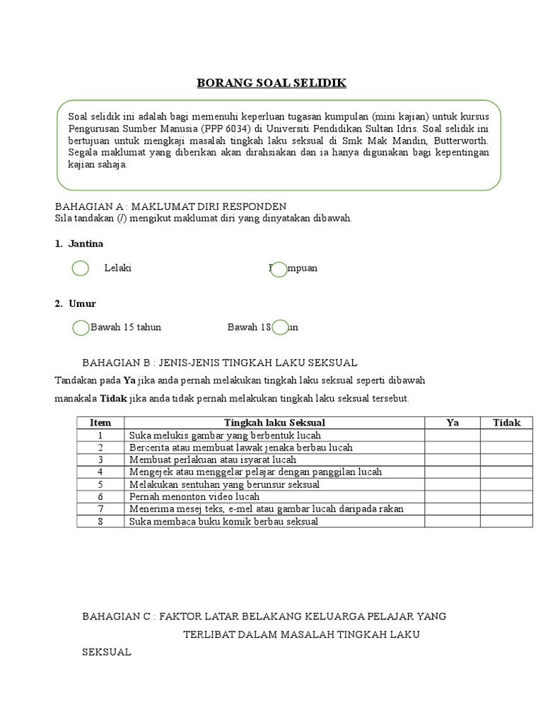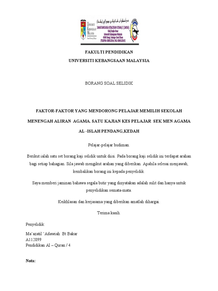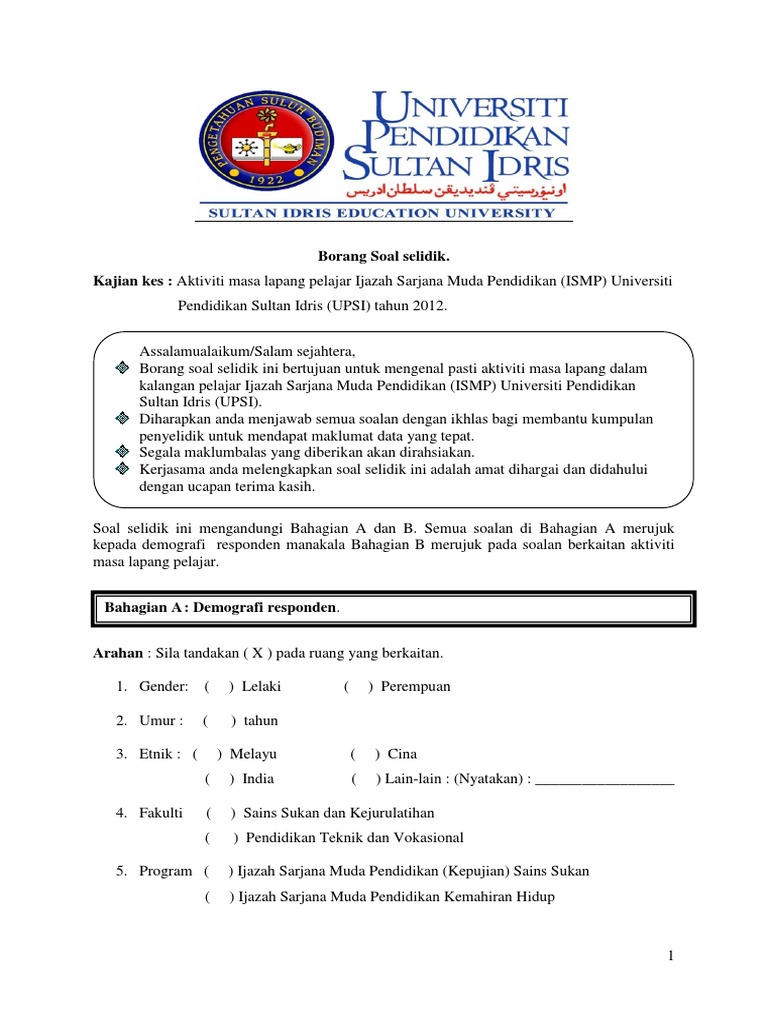 Soal selidik yang dijalankan oleh pihak kami adalah untuk mendapatkan maklumat mengenai. BORANG KAJI SELIDIK KEPUASAN PELAJAR FAKULTI PENDIDIKAN UNIVERSITI TEKNOLOGI MALAYSIA. 9302020 borang soal selidik atas talian melalui media sos ial di mana mereka lebih mudah berinteraksi dengan jantina sama oleh itu borang soal selidik lebih ramai diedarkan ke kaum perempuan dari lelaki.