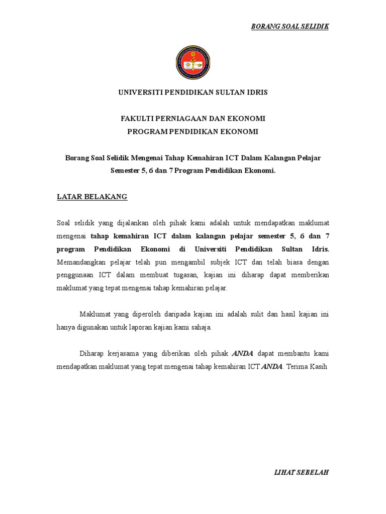 Jawapan yang diberikan ini adalah sulit dan segala maklumat yang dikumpulkan akan digunakan hanya untuk tujuan kajian ini sahaja. Borang Soal Selidik Mengenai Tahap Kemahiran ICT Dalam Kalangan Pelajar Semester 5 dan 6 Program Pendidikan Ekonomi. Kami merupakan pelajar-pelajar dari Universiti Teknologi MARA UITM yang sedang melaksanakan kajian lapangan bagi subjek TITAS.