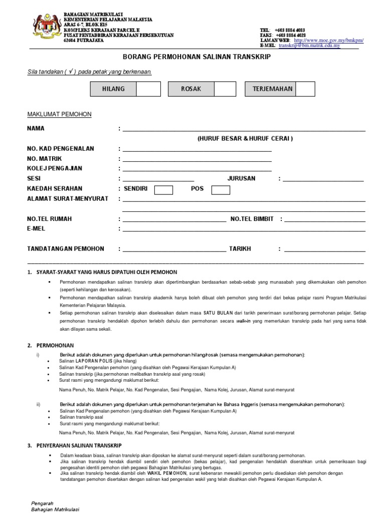 Borang Permohonan Salinan Transkrip Akademik Program Matrikulasi Yang Hilang Atau Rosak Online Pendidikanmalaysia Com