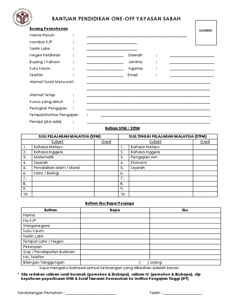Borang Bantuan Pendidikan One Off Yayasan Sabah 2018 1 Pdf