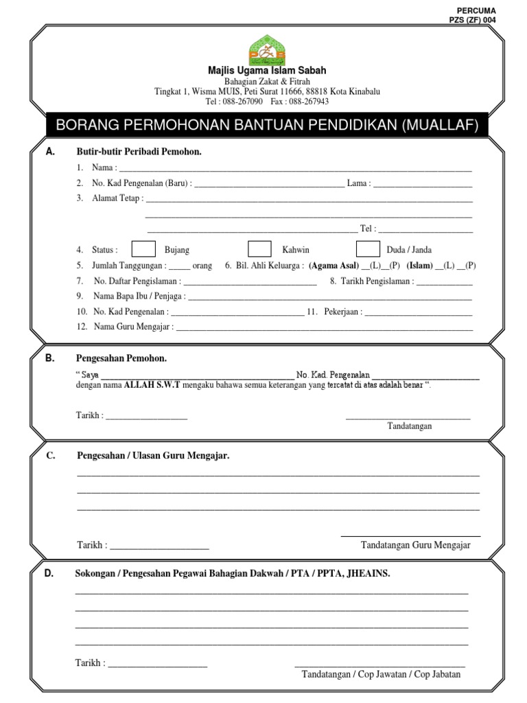 Borang Pengesahan Sekolah RendahMenengah Untuk Asnaf Fakir Miskin. Pemohon bergama Islam berakal dan merdeka. Sila Benarkan pop-up pada pelayar web anda.