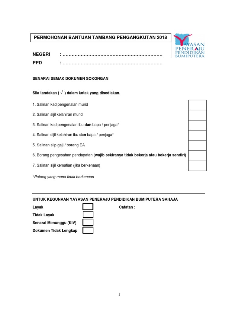 Borang Permohonan Bantuan Tambang Pengangkutan 2018