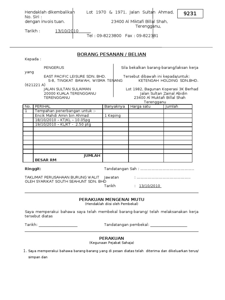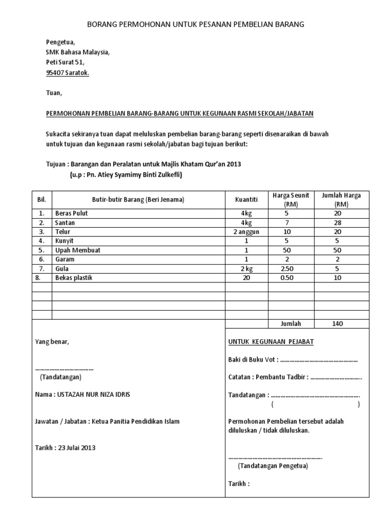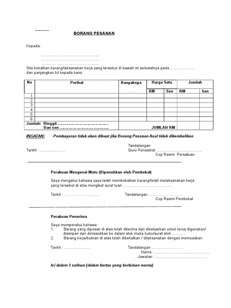 BORANG PERMOHONAN PESANAN MENYEDIAKAN MAKANAN MINUMAM MESYUARAT PEJABAT DAERAH TANAH KUALA LANGAT Persiaran Sultan Abdul Aziz Shah Kota Seri Langat SgSedu 42700 Banting No. Contoh Surat Pemesanan Barang - Surat pemesanan barang merupakan salah satu bentuk surat resmi yang diterbitkan oleh pembeli yang berisi tentang permintaan pembelian suatu barang tertentu yang ditujukan kepada pihak lainnya yang menjual barang baik itu perorangan maupun mewakili perusahaan. PESANAN KERAJAAN 1Bagi perolehan bekalan dan perkhidmatan secara bukan bermasa yang bernilai tidak melebihi RM20000.